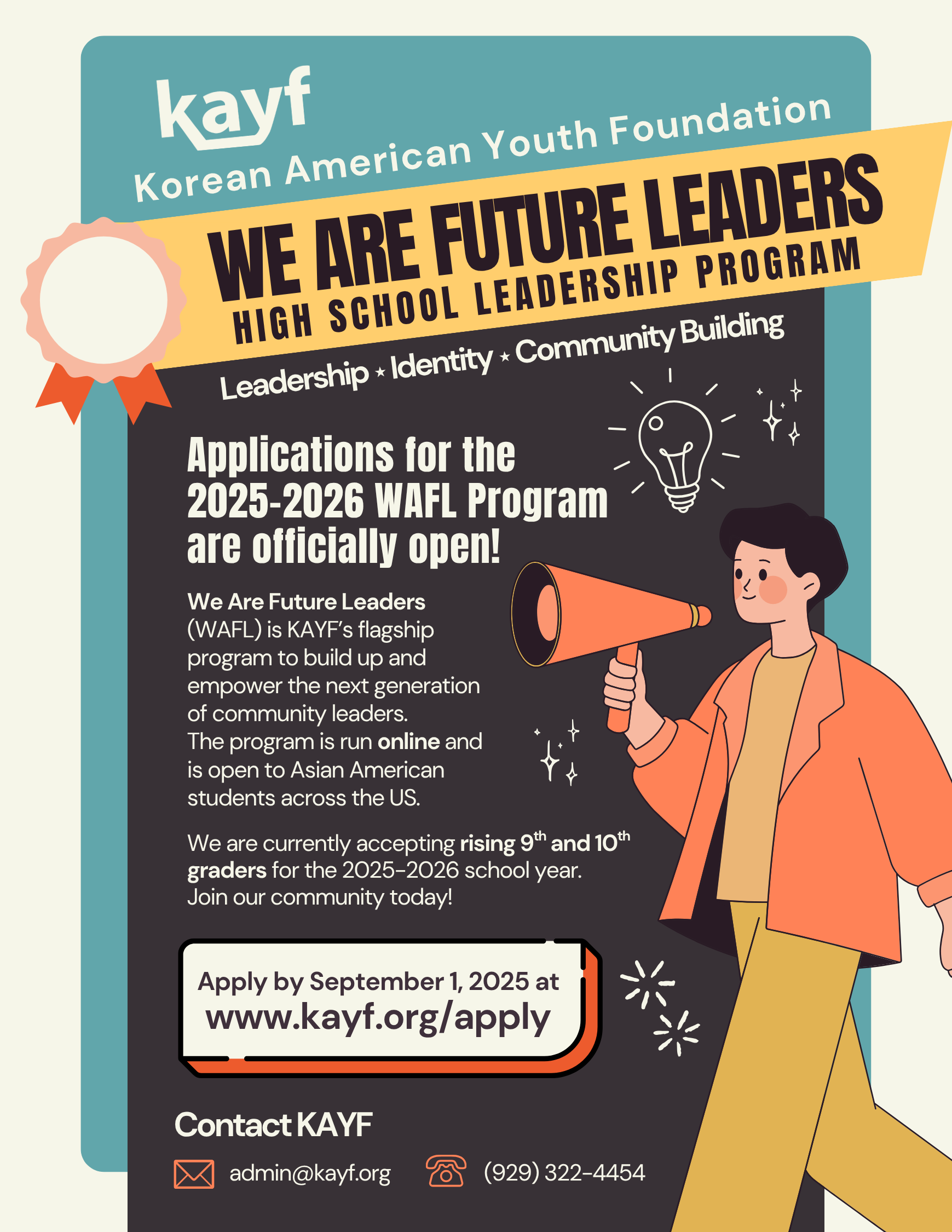 We Are Future Leaders (WAFL, pronounced like the breakfast food) is KAYF’s nationwide program to empower the next generation of Asian American community leaders.